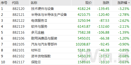 从下跌板块来看,技术硬件与设备、半导体、电信服务、软件与服务、多元金融等板块跌幅居前。