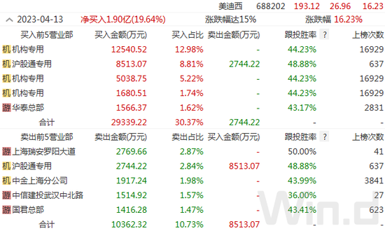 4月13日,CRO龙头美迪西底部放量大涨16.23%,成交额9.66亿元,换手率8.91%,盘后龙虎榜数据显示,沪股通专用席位净买入5700多万元,三机构净买入1.93亿元。