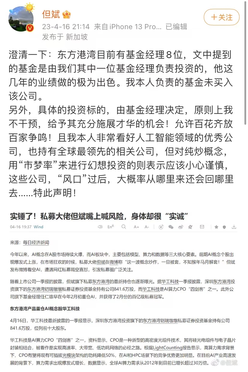 4月16日,每经网发布的题为《实锤了!私募大佬但斌嘴上喊风险,身体却很“实诚”:东方港湾产品重仓算力股华工科技!还密集调研了这些AI股》一文引发市场关注。