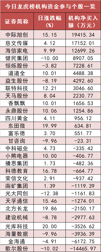 盘后龙虎榜数据显示,机构现身29股,其中中际旭创等14股现机构资金净买入,歌尔股份等15股呈现机构资金净卖出。