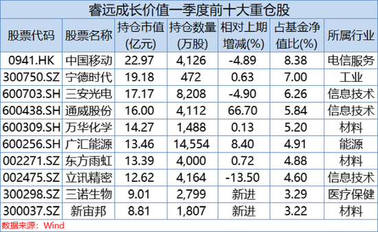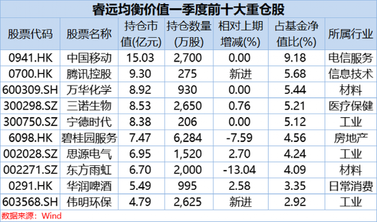 其他重仓股方面,中国移动仍为睿远均衡价值第一大重仓股,伟明环保新进前十大重仓股,威高股份退出前十大重仓股。