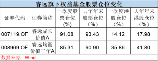 一季报数据显示,截止一季度末,睿远成长价值基金股票仓位91.08%,连续7个季度保持90%以上高仓位运作;一季度港股仓位14.12%,相比去年年末下降3.86%。