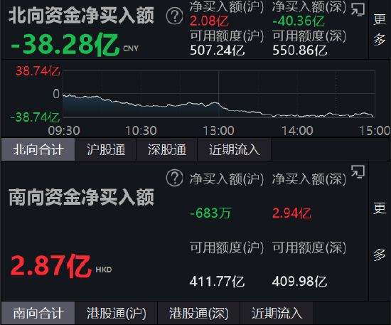 4月24日消息,截至沪深股市收盘,北向资金全天净卖出38.28亿元,其中沪股通净买入2.08亿元,深股通净卖出40.36亿元。