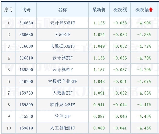 下跌方面,AI概念股走势分化,算力、国资云等方向走弱。多只云计算、大数据、软件相关ETF集体跌逾4%。