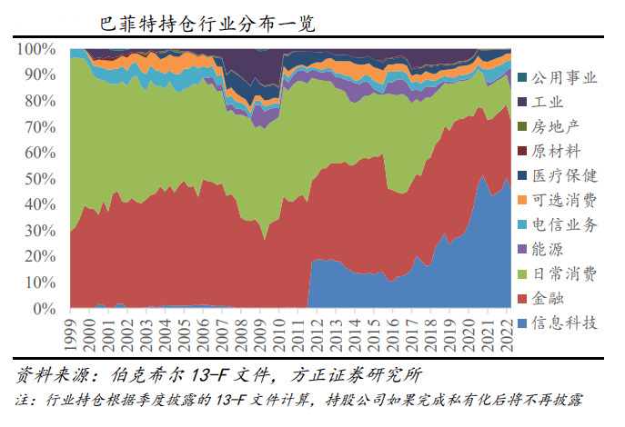 根据分析师的研究,2011年之前,巴菲特对行业配置集中于金融与日常消费,2011年之后逐渐进军信息科技领域,日常消费行业占比逐渐下降,金融行业占比相对稳定,目前已经形成了信息科技、金融、消费为前三大持仓行业的格局。