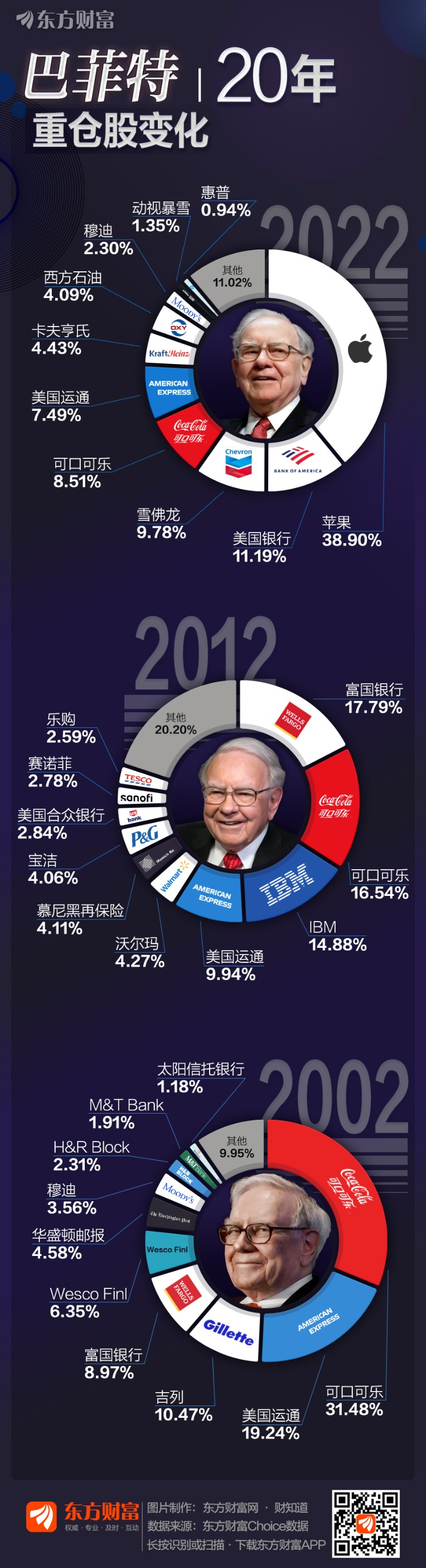 纵观巴菲特的持仓,虽说年代跨度很长,但并不繁杂,45年来,在其年报中提及的持仓不过100家左右,尤其那些大手笔持仓,也就那么十几二十家。其中,盖可保险、可口可乐、富国银行、苹果是占据其重仓股榜首时间最长的4家。