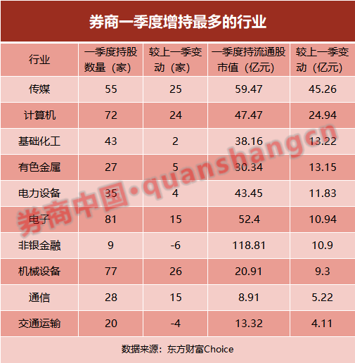 分行业来看,传媒、计算机、基础化工、有色金属行业在一季度获得券商大手笔加仓,房地产、医药生物行业则遭券商大幅减仓。