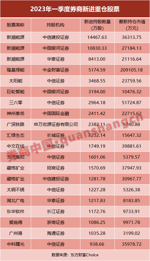 个股方面,从进入前十大流通股东数据看,Choice数据显示,2023年一季度,券商自营盘共新进293只股票。