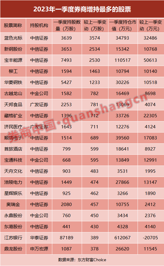 此外,中信证券自营盘还在一季度大幅增持新钢股份、宝丰能源、柳工、华菱钢铁,新增持股数均超1000万股。中金公司自营盘大手笔增持古越龙山、宝通科技,广发证券自营盘则大幅增持了天邦食品、济民医疗。