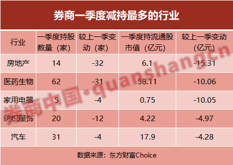 此外,医药生物、家用电器行业的券商自营盘持有流通股市值也在今年一季度下降了约10亿元,其中券商持有的医药生物行业上市公司数量在一季度减少了31家。