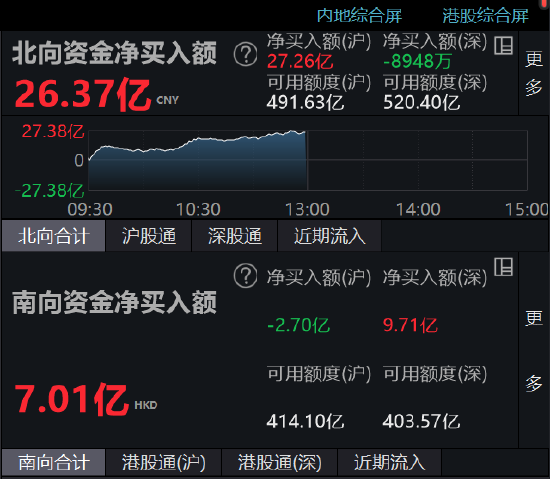 午评:北向资金净流入26.37亿,沪股通净流入27.26亿