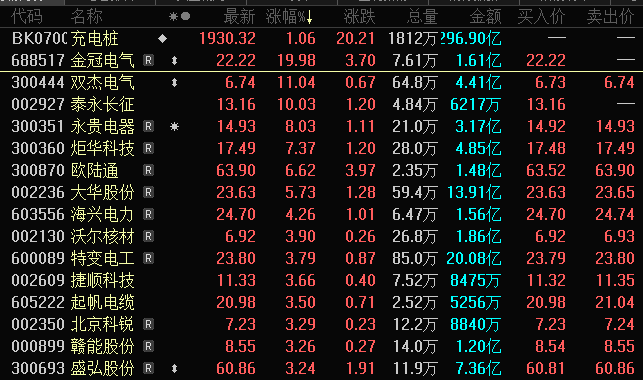 充电桩概念股早盘强势拉升,金冠电气20cm涨停,泰永长征涨停,永贵电器、双杰电气等多股大涨。