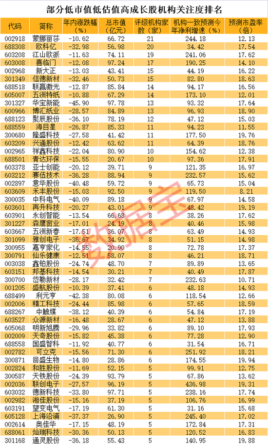 不过,这其中还有些机构关注度较高、业绩较好的小市值股票。其中,科锐国际、亿田智能、巴比食品等个股有20多家机构评级,华锐精密、江山欧派 、瑞可达等个股有10多家机构评级。