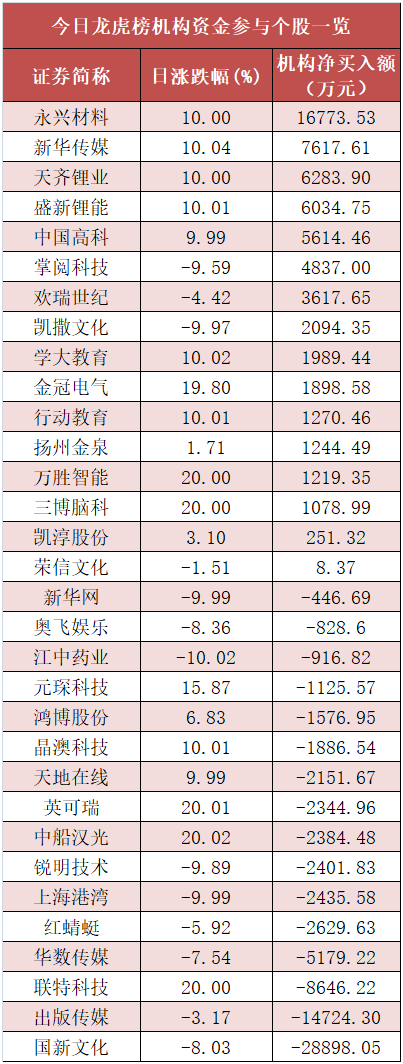 盘后龙虎榜数据显示,机构现身32股,其中永兴材料等16股现机构资金净买入,国新文化等16股呈现机构资金净卖出。