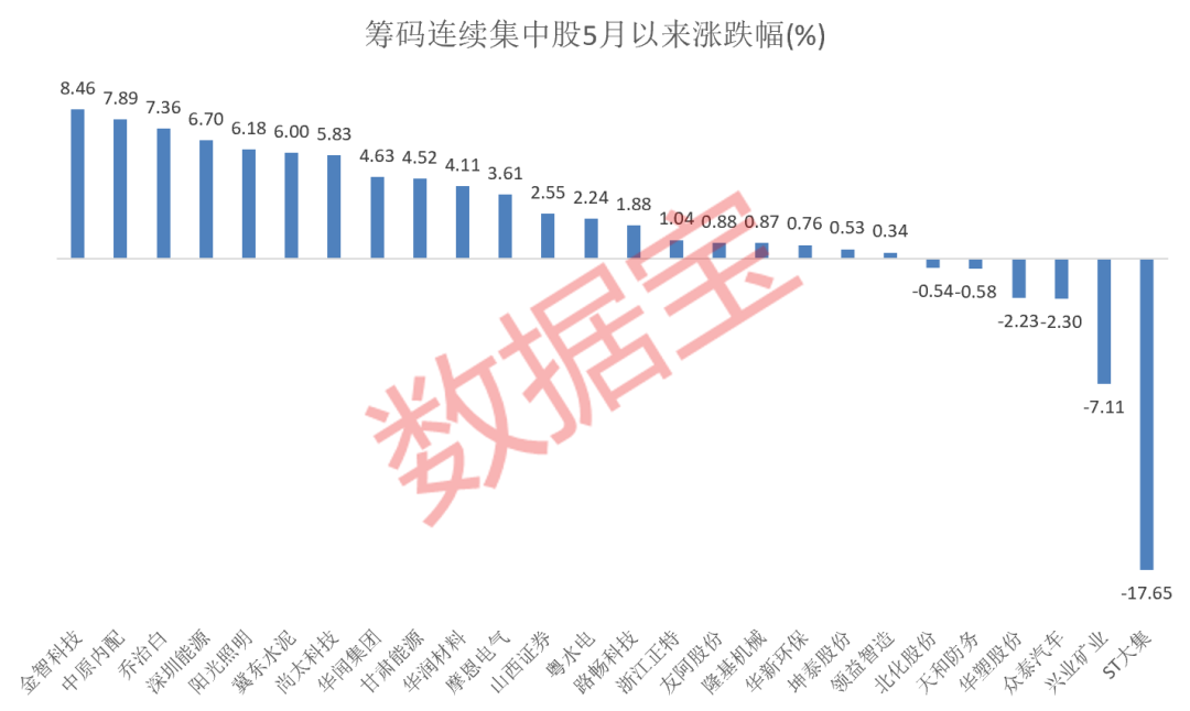 一般来说,筹码连续集中代表着持股方的减少和持股力量的集中,有利于大资金后续对个股股价拉升。数据宝统计,5月至今,上述26股平均涨幅1.77%,近八成个股录得涨幅。其中金智科技中原内配乔治白等7股涨逾5%;ST大集(维权)股价下跌较多,为17.65%。