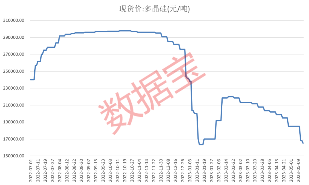 近期,多晶硅价格持续下跌。5月15日,多晶硅现货价格跌至165000元/吨,月内跌超10%。相较于2月价格高点220000元/吨,则跌幅达到25%。