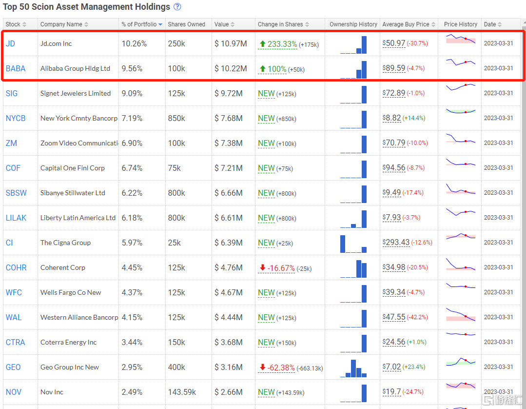 格隆汇5月16日丨13F报告显示,今年第一季度,“大空头”投资者Michael Burry旗下的Scion资产管理大笔买入京东、阿里巴巴美股,对应仓位分别从75,000股上升至250,000股和从50,000股上升至100,000股,成为Michael Burry管理下的两个最大仓位(京东10.26%,阿里巴巴9.56%)。