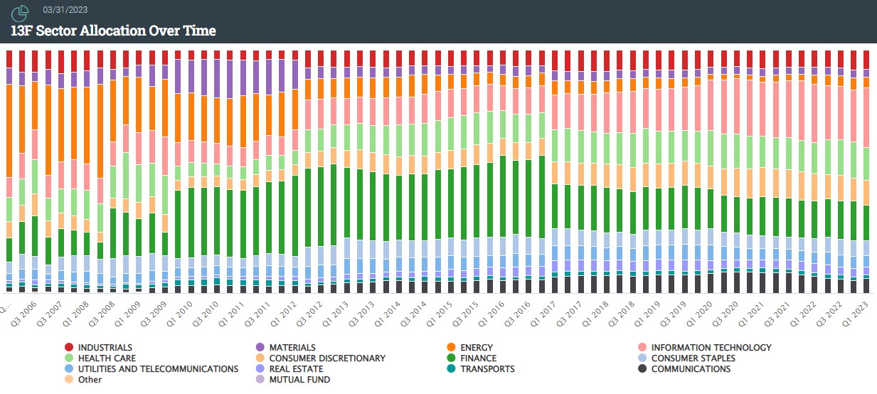 从持仓偏好来看,贝莱德青睐科技股,占总持仓的比例为24.37%。紧接着是金融股和医疗保健股,分别占总持仓的14.88%和13.62%。