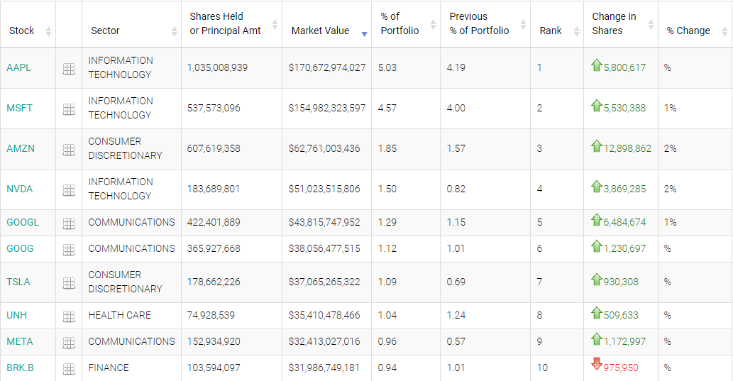 $微软(MSFT.US)$位列第二,持仓约5.38亿股,持仓市值约1549.8亿美元,占持仓总市值的4.57%。