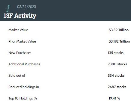 根据美国证券交易委员会(SEC)披露,$贝莱德(BLK.US)$递交了截至2023年3月31日的第一季度(Q1)持仓报告(13F)。