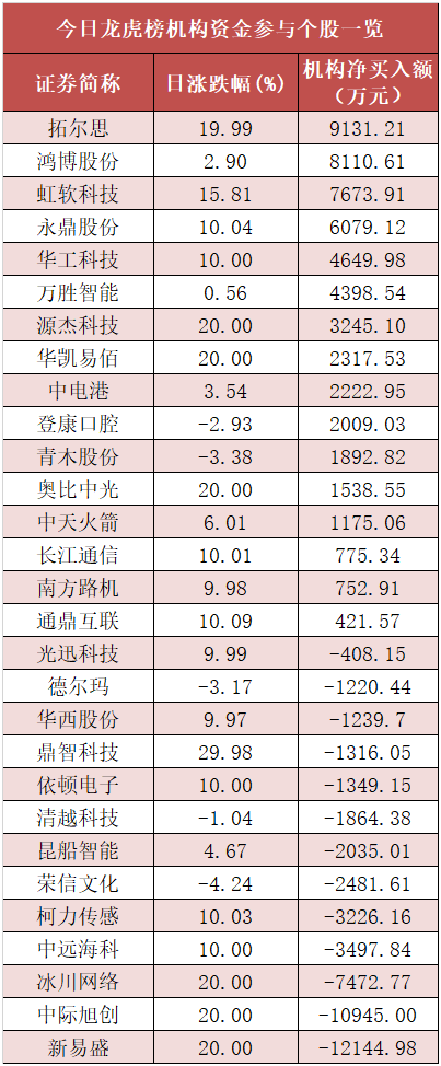 盘后龙虎榜数据显示,机构现身29股,其中拓尔思等16股现机构资金净买入,新易盛等13股呈现机构资金净卖出。
