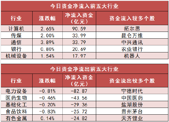 申万一级行业中,10个行业实现资金净流入,其中计算机行业净流入90.59亿元居首。