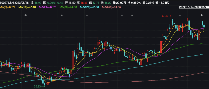 今年以来,恒瑞医药的股价整体呈上升态势。截至5月18日收盘,恒瑞医药的股价收于48.02元/股,二季度内累计上涨12.14%,年内累计上涨24.63%。