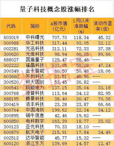 证券时报.数据宝统计,截至5月18日收盘,量子科技概念股今年以来平均涨幅达到27.06%,大幅跑赢同期上证指数。由于不少量子科技概念股叠加人工智能题材,今年以来涨势喜人。中科曙光、华工科技、光迅科技、光库科技、国盾量子、福晶科技和金卡智能等年内涨幅超过50%。中科曙光累计涨幅118.34%排在首位,今年4月25日盘中,该股创下历史新高。