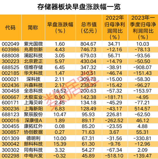 受到存储器价格下跌影响,A股存储器板块上市公司2022年、2023年一季度净利润普遍下滑,其中2022年度4家上市公司出现亏损,2023年一季度亏损公司数量扩大到5家,仅协创数据和紫光国微业绩持续增长。