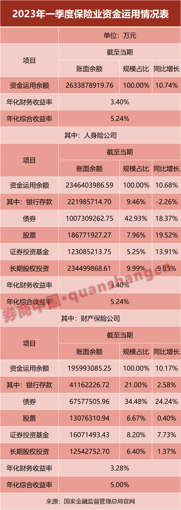 国家金融监督管理总局5月18日成立后,19日公布了2023年一季度保险业资金运用情况。截至一季度末,保险业(不含明天系4家保险公司,包括独立账户和非独立账户)资金运用余额为26.34万亿元;一季度,年化财务投资收益率为3.40%,年化综合投资收益率为5.24%。