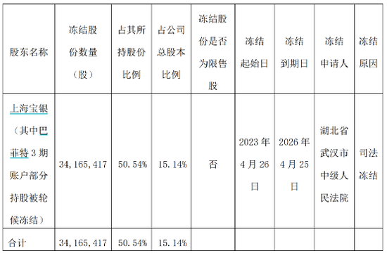 根据湖北省武汉市中级人民法院(2022)鄂01执3019号之三,巴菲特3期所持3416.54万股无限售流通股被轮候冻结,冻结时间自2023年4月26日起至2026年4月25日止。