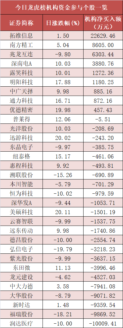 盘后龙虎榜数据显示,机构现身32股,其中拓维信息等9股现机构资金净买入,润达医疗等23股呈现机构资金净卖出。