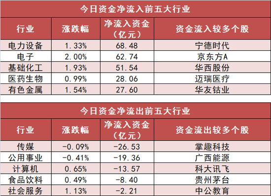 申万一级行业中,25个行业实现资金净流入,其中电力设备行业净流入68.48亿元居首。