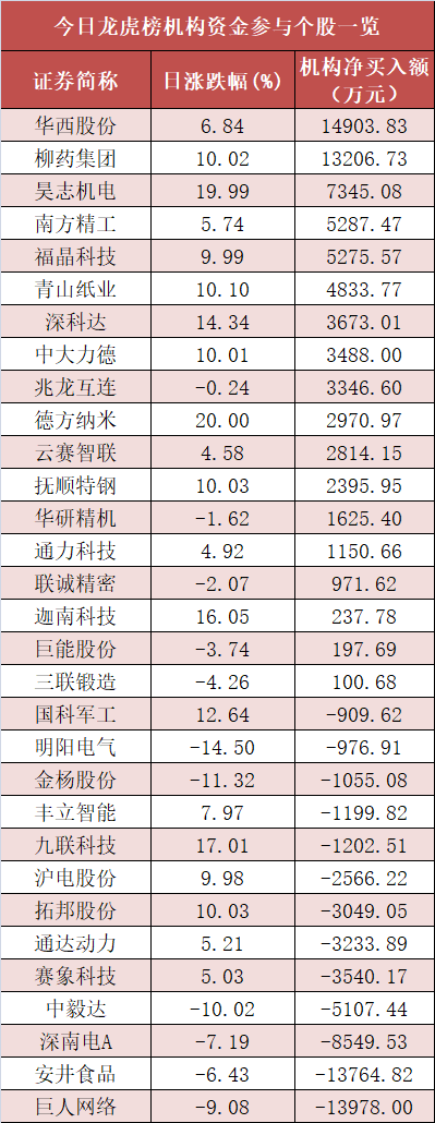 盘后龙虎榜数据显示,机构现身31股,其中华西股份等18股现机构资金净买入,巨人网络等13股呈现机构资金净卖出。
