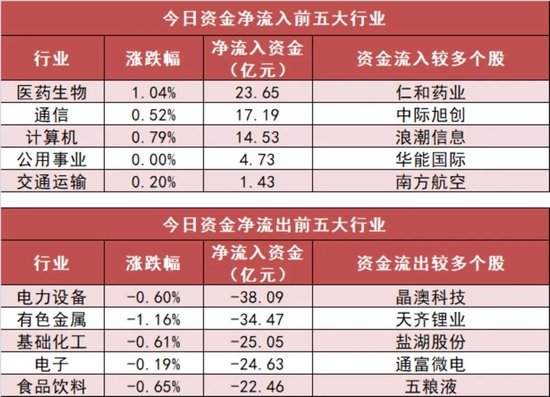 申万一级行业中,6个行业实现资金净流入,其中医药生物行业净流入23.65亿元居首。