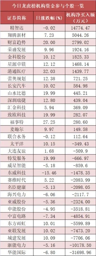 盘后龙虎榜数据显示,机构现身32股,其中精智达等16股现机构资金净买入,华能国际等16股呈现机构资金净卖出。