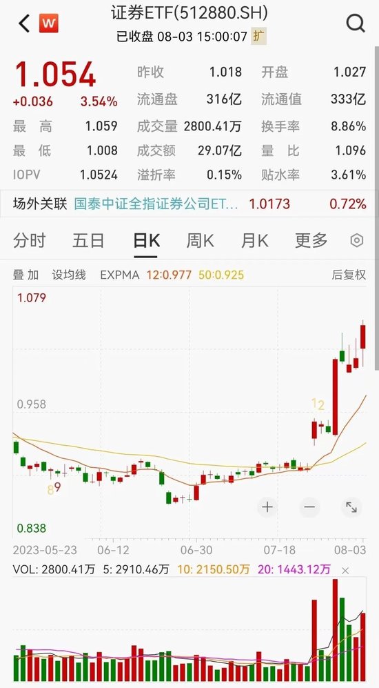 证券板块尾盘拉升,证券ETF收涨3.54%。