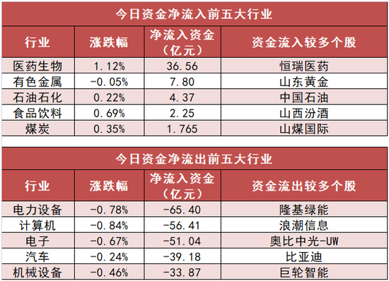 申万一级行业中,5个行业实现资金净流入,其中医药生物行业净流入36.56亿元居首。