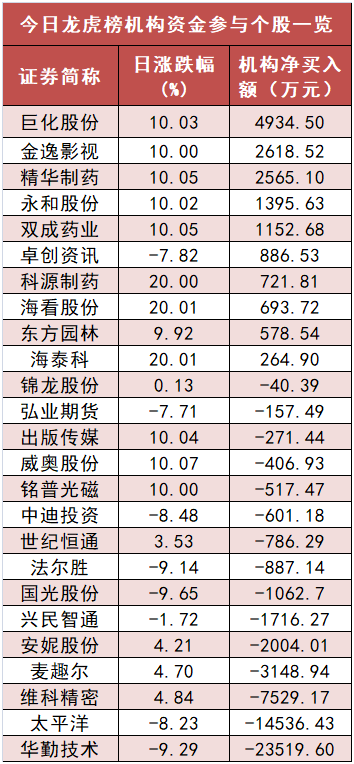 盘后龙虎榜数据显示,机构现身25股,其中巨化股份等10股现机构资金净买入,华勤技术等15股呈现机构资金净卖出。