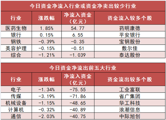 申万一级行业中,2个行业实现资金净流入,其中医药生物行业净流入54.77亿元居首。