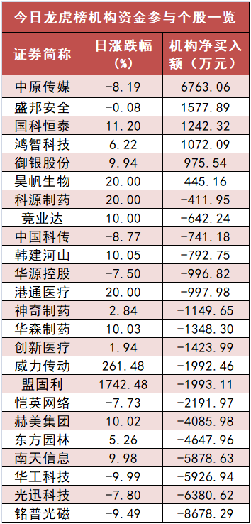 盘后龙虎榜数据显示,机构现身24股,其中中原传媒等6股现机构资金净买入,铭普光磁(维权)等18股呈现机构资金净卖出。