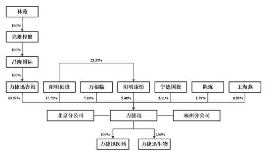 力捷迅的实控股东为力捷迅咨询,实际控制人林苑通过持有亮雄控制100%股权,间接持有昌隆国际100%股权,进而控制公司控股股东力捷迅咨询100%股权。