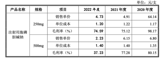 据招股书,公司注射用胞磷胆碱钠(250mg)于2021年1月中标山东省集采,并于2022年6月续标。受山东省集采中标价格较低影响,2020年至 2022年1-6 月,公司该产品在“同类竞品中标集采地区”销售收入分别为0.19亿元、0.12亿元及0.04亿元,下降明显。其中,注射用胞磷胆碱钠(250mg)销售单价从64.14元/支下降到4.91元/支,降幅为92%。