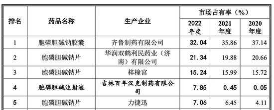 报告期内,可比公司梓橦宫的市场占有率为15.72%、15.99%和15.24%,略有下降;而力捷迅胞磷胆碱钠的市场占有率逐渐上升,分别为4.11%、6.45%和7.06%。尽管如此,力捷迅的主力产品胞磷胆碱钠片要想赶超市面上的其他同类型产品,还有很大压力:2022年,齐鲁制药有限公司的胞磷胆碱钠胶囊市场占有率为32.04%,华润双鹤利民药业(济南)有限公司的胞磷胆碱钠片市占率为21.34%,均远远高于力捷迅。