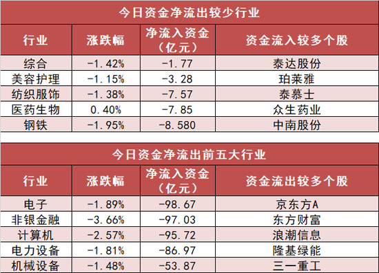 申万一级行业中,无一行业实现资金净流入,电子、非银金融、计算机等行业资金净流出规模居前,其中电子行业净流出98.67亿元居首。
