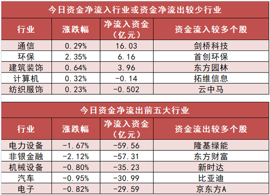 申万一级行业中,3个行业实现资金净流入,其中通信行业净流入16.03亿元居首。