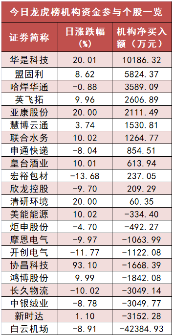 盘后龙虎榜数据显示,机构现身22股,其中华是科技等12股现机构资金净买入,白云机场等10股呈现机构资金净卖出。