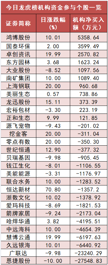 盘后龙虎榜数据显示,机构现身29股,其中鸿博股份等11股现机构资金净买入,恩捷股份等18股呈现机构资金净卖出。