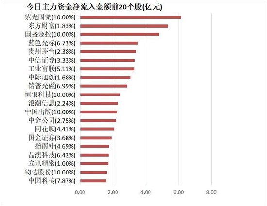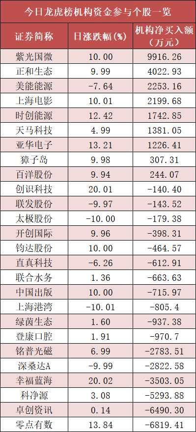 盘后龙虎榜数据显示,机构现身26股,其中紫光国微等9股现机构资金净买入,零点有数等17股呈现机构资金净卖出。
