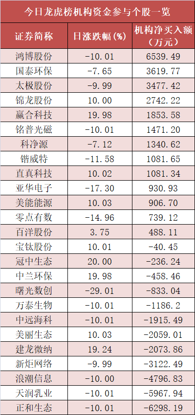 盘后龙虎榜数据显示,机构现身25股,其中鸿博股份等13股现机构资金净买入,正和生态等12股呈现机构资金净卖出。
